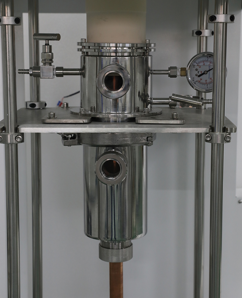 此款淬火炉为气淬炉,与传统淬火炉的区别是法兰下面接有真空腔体,腔体上有两对进气口,待物料加热完毕,把物料拉至真空腔体处,用气吹,其优点是气淬比油淬和水淬更洁净,更好的避免物料被污染。