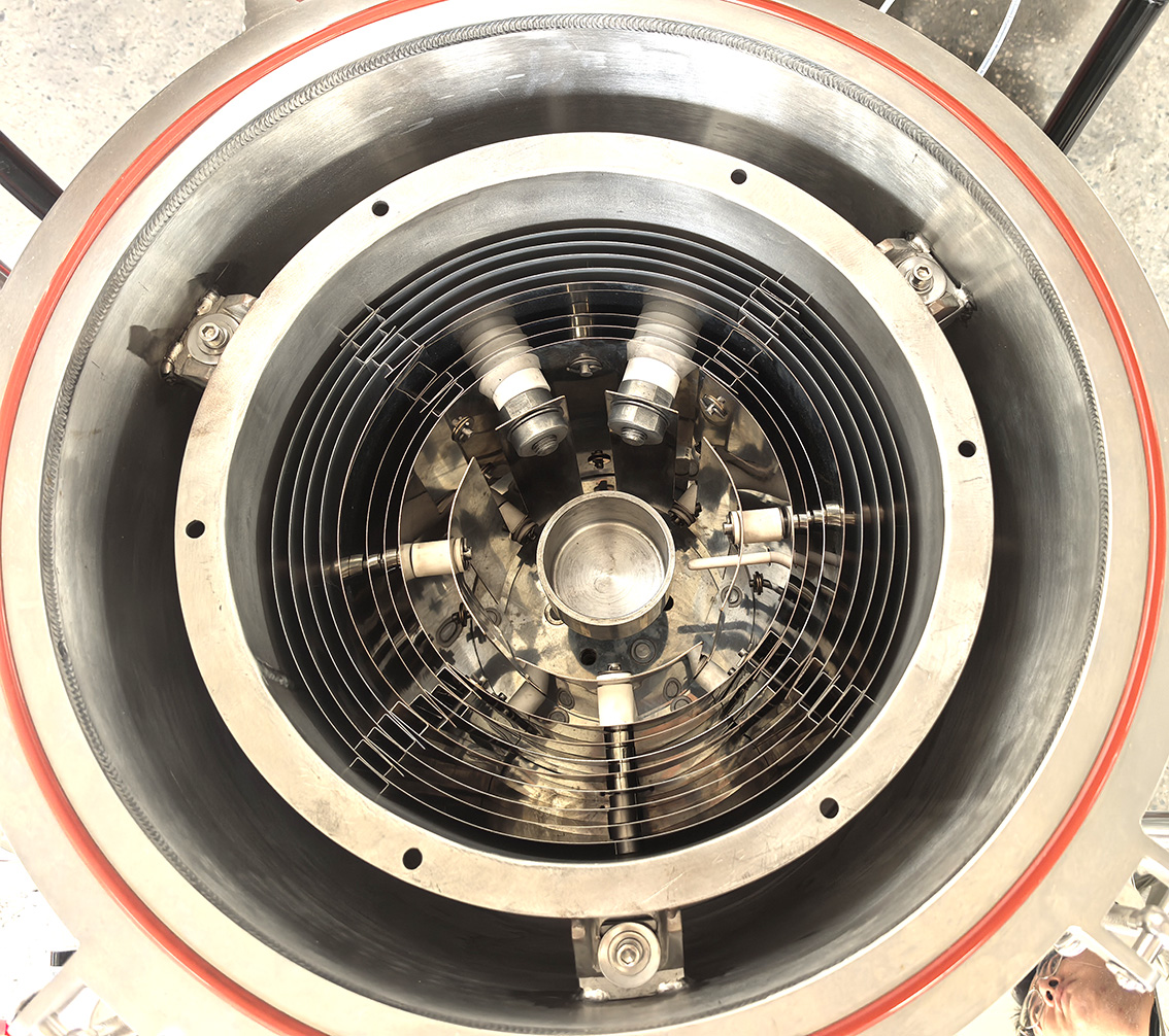 腔体采用钼和不锈钢作为隔热屏,钼片为加热元件 有效加热面积Dia100X100mm 腔体无杂质,不污染材料 超声振动头在坩埚下方 |